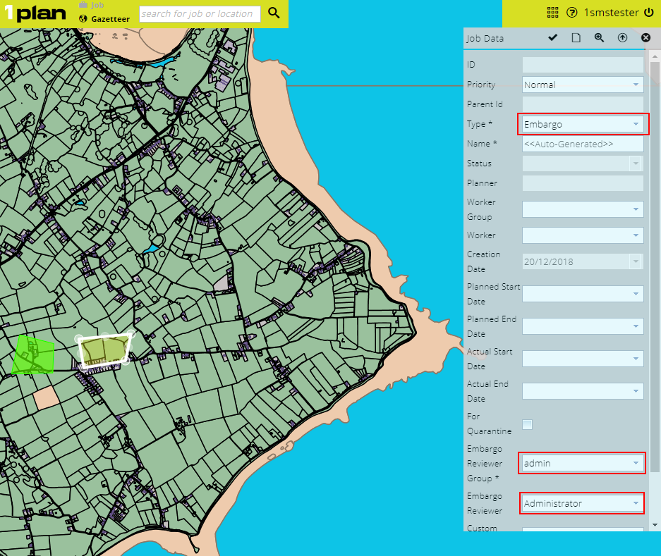 3. Next, in 1Plan, you can define a job extent to be worked on, set the Job Type, which user is to edit the extent and who is to be the Embargo Reviewer Group (required) and who is to be the Embargo Reviewer (optional).