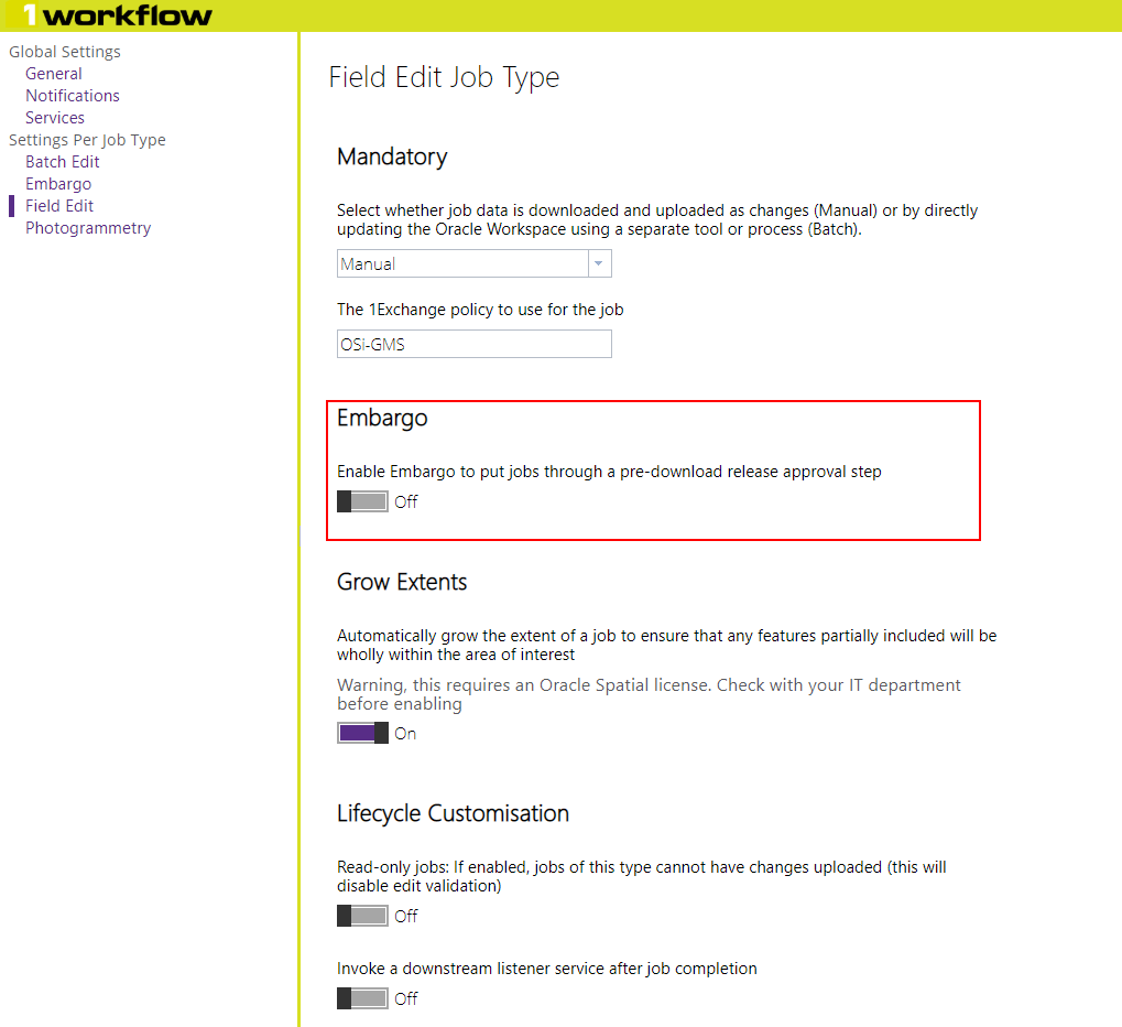1. In the Admin settings for 1SMS, select one of the Settings Per Job Type (i.e Field Edit or Photogrammetry) where you will be enabling the Embargoed state.