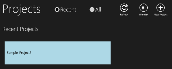 BY default, the Projects page is filtered by Recent to display the most recently opened projects first. To see all available projects, click All. Click Refresh to display any data that has been added since the Projects page was first loaded.