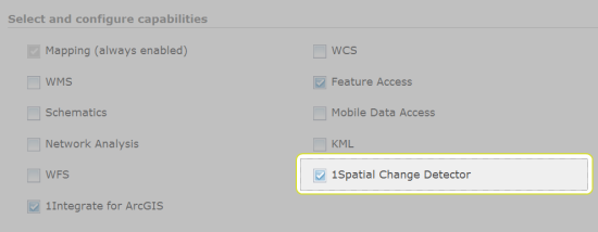 Under "Select and configure capabilities", check the box next to 1Spatial Change Detector to enable it.