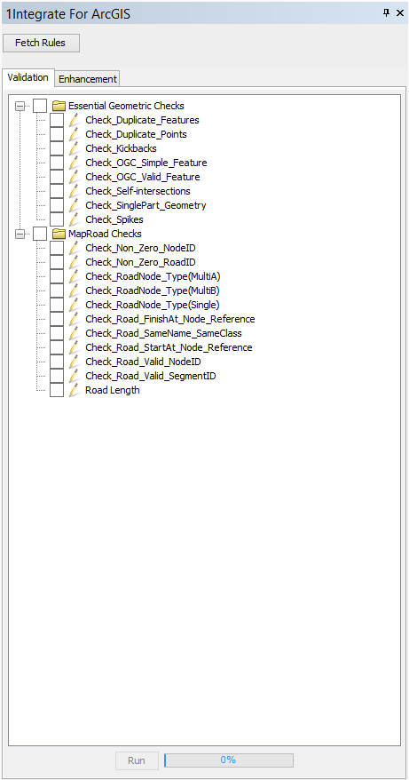 Rules are split into Validation and Enhancement tabs, depending on the type of action associated with each rule (Report or Enhance).