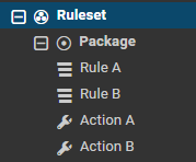An example Rule Set, containing a Package, containing Rules and Actions.