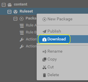 A Rule Set is made up of one or more Packages containing Rules, Quick Rules, Actions and Quick Actions. Rule Sets are used to manage, publish, backup and restore these Packages.