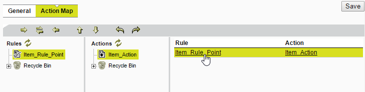 Clicking on a Rule or Action listed in the right-hand table will open the related Rule or Action.
