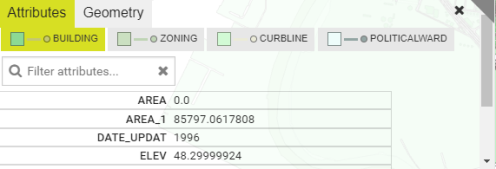 When clicking on the map, the objects close to the click location are selected and shown in a list under the panel tabs. Select the object in the list to highlight it in the map view and show the attributes or geometry of that object in the panel.