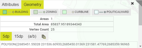 The Attributes tab lists those attributes that are non-null for the selected object. The Geometry tab lists the calculated geometry metadata (such as number of parts, number of vertices, area, length) and also the Well-Known Text definition of the geometry with options for listing vertices as 5 decimal places, 15 decimal places or fractional form. The copy button copies the geometry into the clipboard.