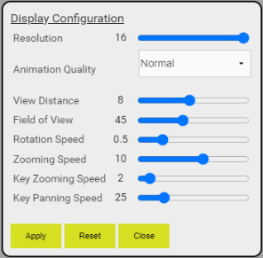 will give you a number of configuration options for the viewer which are used to maintain performance, particularly in 3D mode, by controlling aspects such as distance, resolution or field of view. Modify these if your machine is struggling to render the 3D view quickly enough. Click Reset to return to default values.