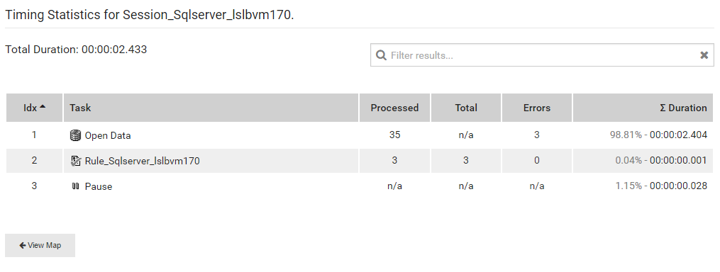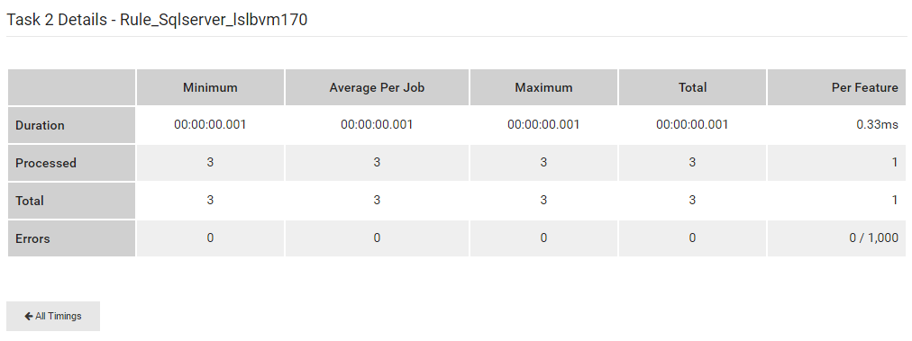 Basic statistics such as number of jobs processed, number of errors and duration are displayed for each task.