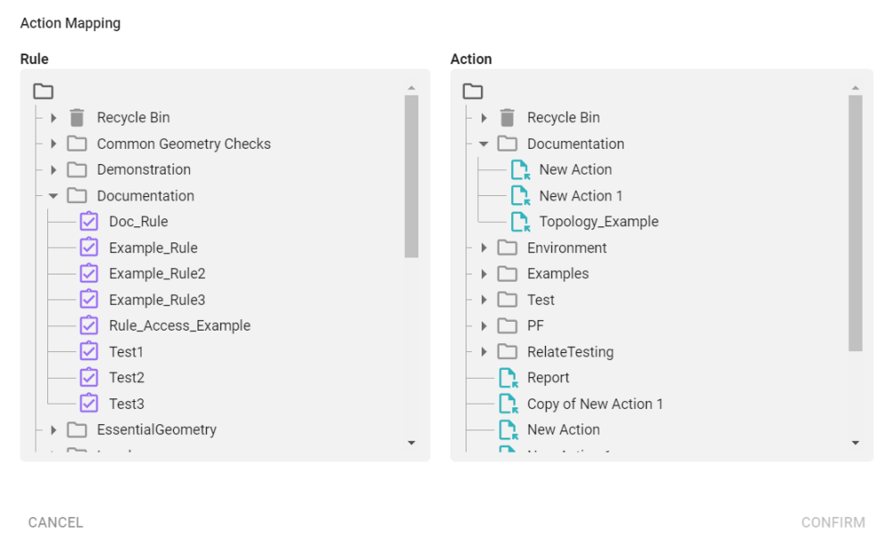 Action Maps are used to connect an Actions to Rules in pairs, so that Actions can be invoked when a feature is found that does not conform to a particular Rule.