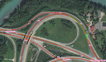 Le SIR permet de représenter sur deux axes différents les deux sens de circulation de l’autoroute sur une carte déployée en mode web. ATMB gère une quarantaine de couches de données différentes organisées par thématiques métier (fond de plan, foncier, espaces verts, photogrammétrie, ouvrages, poteaux, dispositifs de retenue, signalisation verticale, aires de repos, échangeurs, postes de douanes…).