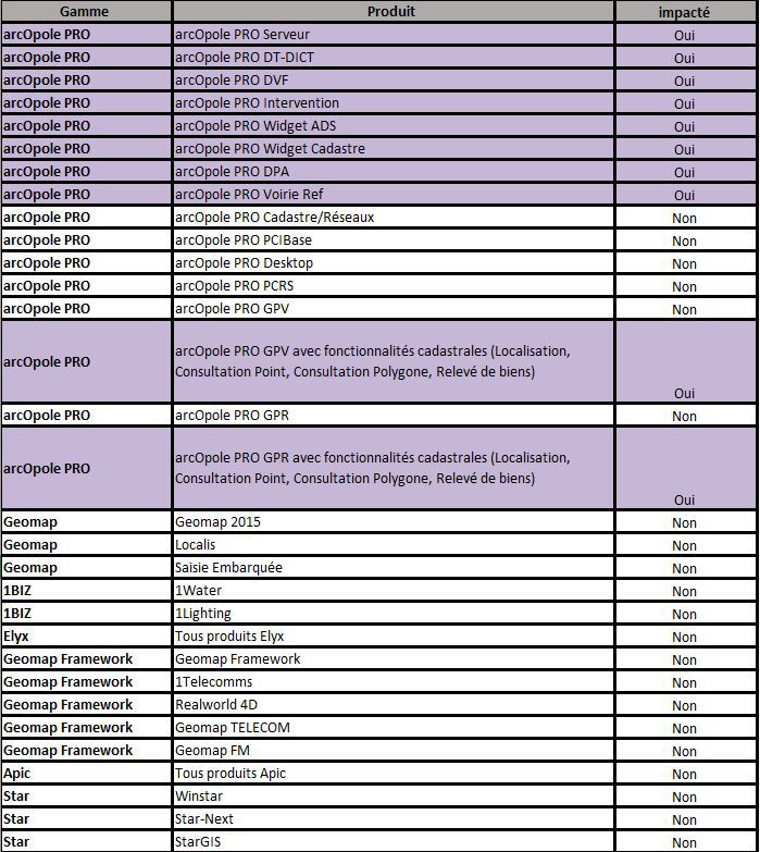 Les cas impactés sont sur fond mauve dans le tableau. Ce sont les produits utilisant le moteur arcOpole PRO Serveur.