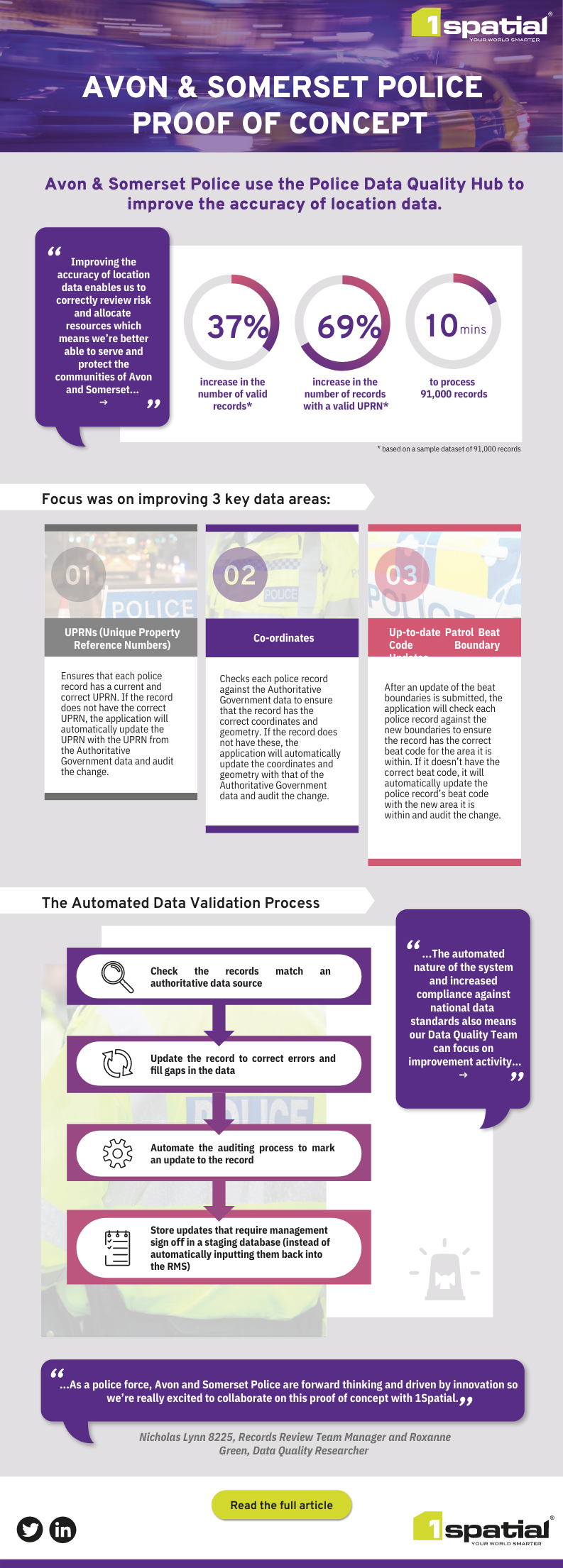 “As a police force, Avon and Somerset Police are forward thinking and driven by innovation so we’re really excited to collaborate on this proof of concept with 1Spatial. Improving the accuracy of location data enables us to correctly review risk and allocate resources which means we’re better able to serve and protect the communities of Avon and Somerset. The automated nature of the system and increased compliance against national Data standards also means our Data Quality Team can focus on improvement activity.” - Nicholas Lynn 8225, Records Review Team Manager and Roxanne Green, Data Quality Researcher