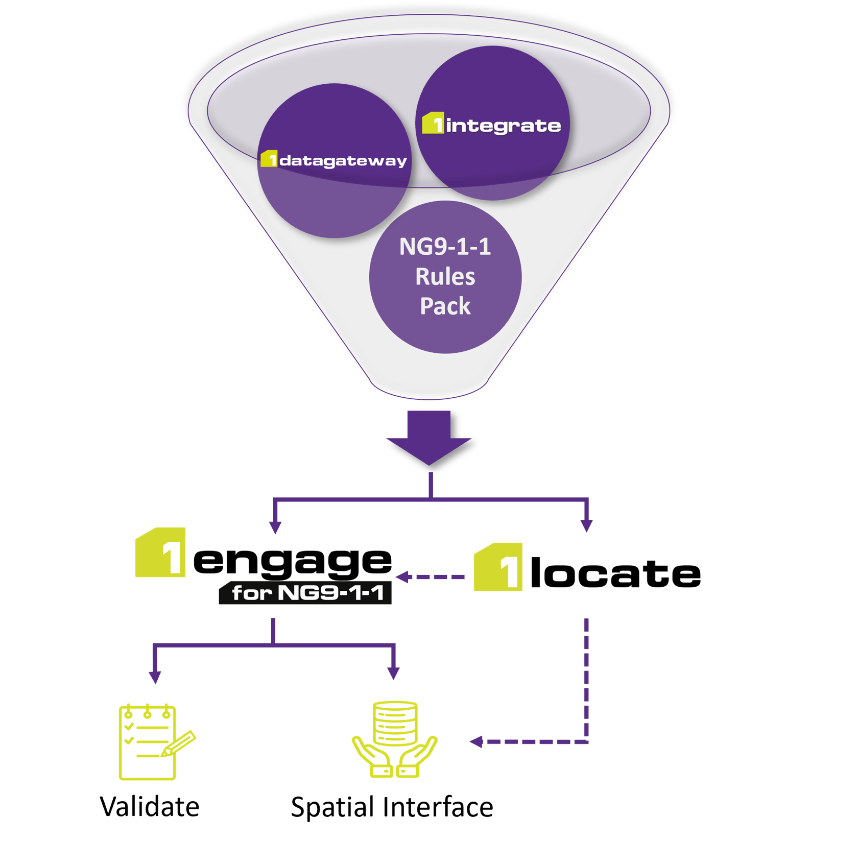 1Engage and 1Locate harness the robust rules engine and data consolidation features of 1Spatial software, deployed on a ready-to-use, cloud-based framework. Tailored to assist 911 authorities and data contributors, these solutions facilitate compliance with the ultimate NENA i3 location data standards. Utilizing a rules-based approach, aligned with NENA and FCC guidelines and adaptable to state-specific requirements, users can swiftly identify and address discrepancies.